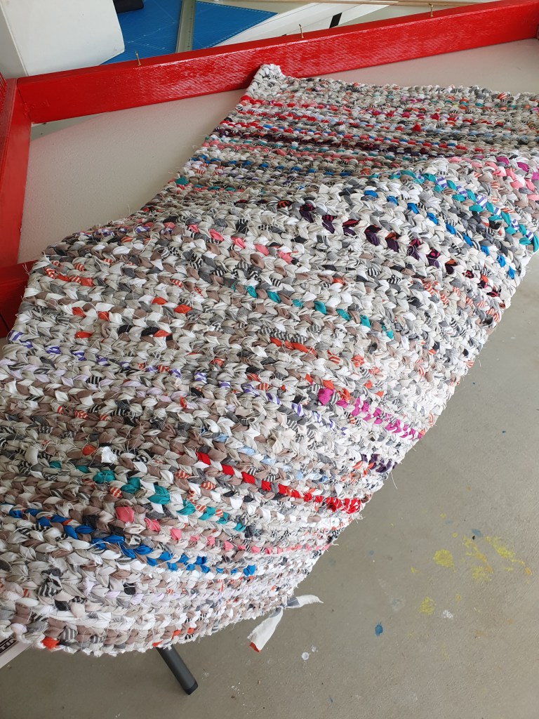 Once I’d made the loom and learned how to do the plain twining weaving, I was hooked. I’ve mentioned it before, I’m a Meditation Therapist and twining weaving, once you’ve got the hang of it, is extremely calming for the mind. I spent hours working on this carpet even talking to clients on the phone whilst weaving, and it was whilst I was doing this that I realised that I was weaving the energy of the conversations into the carpet. Dream Weaving and a Carpet for Cardwell was birthed. I’m now weaving my 2nd carpet (also my 15th place mat; 9th dream catcher and about a dozen mandalas made from the cardboard tubes inside toilet rolls!)