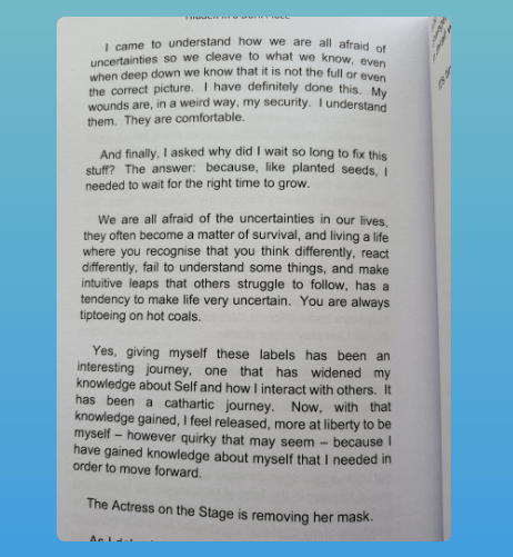 This morning, as I write this, a post appeared in my Facebook feed. It was a picture of a page from a book. I read the text, thinking that I really could relate to what the author was saying. I loved the syntax, the choice of words used and even the cadence seemed as if it talked to me. It felt like something I could have written.